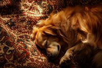Een zacht licht omhult de kalme, gouden vacht van een slapende hond op een tapijt met een rijk patroon. De warme, ontspannen sfeer straalt gezelligheid uit en nodigt uit om te blijven liggen. Deze foto geeft een uitnodigend tintje aan elke woonkamer en roept herinneringen op aan gezellig knuffelen.