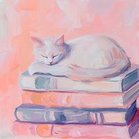 Zachte pastelkleuren omarmen het tafereel, terwijl een pluizige witte kat in stille tevredenheid op een stapel boeken rust. Zijn harige lichaam, zacht gebogen, harmonieert perfect met de zachte textuur van de boekenruggen en straalt een gezellige sfeer uit waarin kennis en rust samenkomen. Een droom van literatuur en sereniteit.