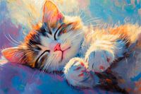 Een kleine, harige dromenvanger ligt in zachte rust, omringd door delicate kleurtonen die het moment van stilte vastleggen. De roze pootjes en het tevreden gezichtje stralen een gevoel van geborgenheid uit, terwijl het licht zachtjes rond het slapende katje speelt. Kleuren en rust smelten hier samen tot een perfecte symfonie van ontspanning.