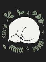 Een romantische illustratie van een kat omringd door bladvormen en planten op een zwarte achtergrond.