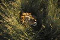 Tussen het hoge gras op de savanne ligt een slapend leeuw te genieten van het laatste gouden zonlicht.