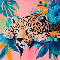 Het prachtige luipaard rust met gesloten ogen zachtjes uit op een weelderig bladerlandschap. Omringd door felle bloemen en een intens kleurenspel straalt het een harmonieuze sereniteit uit. Het elegante bontpatroon en de levendige kleuren geven het beeld een exotische uitstraling die je direct meevoert naar de tropische natuur.
