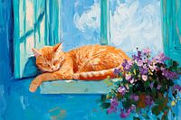 Een heldere, oranje kater geniet van de zonnestralen op een vensterbank, omringd door kleurrijke bloemen. De frisse, heldere kleuren en vredige sfeer geven elke kamer een vleugje gezelligheid. Ideaal voor in de woonkamer, waar deze aanblik uitnodigt om te ontspannen en het alledaagse leven te vergeten.