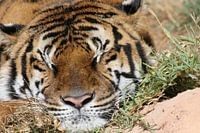 Baddend in de zon en op een natuurlijke kussen van gras en zand, heel tevreden ligt deze tijger te slapen. Leuk voor in de slaapkamer boven de bed of juist om de ontspannende sfeer in de kamer te creëren.