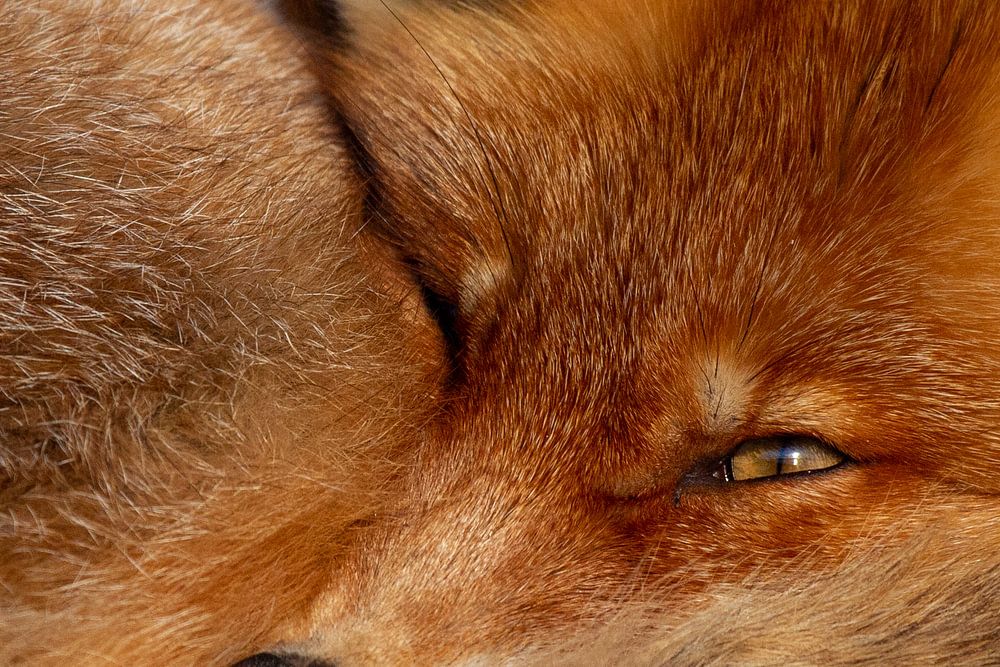 Een vos die op een rots ligt in het zonnetje, maar wel met een oog de omgeving in de gaten houd.
