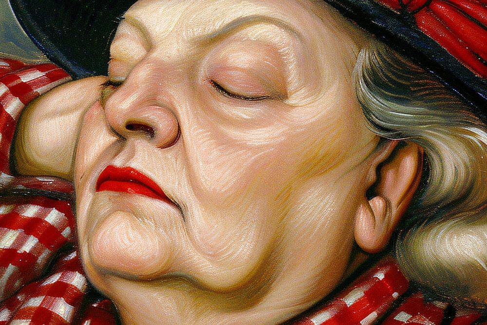 Dit schilderij toont een serene, slapende vrouw, vastgelegd in een intiem moment van rust. De zachte, realistische weergave van haar gelaatstrekken, gecombineerd met de levendige rode en witte tinten van haar blouse, roept een gevoel van nostalgie en comfort op. De eenvoudige maar krachtige compositie vangt de schoonheid van alledaagse momenten en is een perfecte aanvulling voor ruimtes waar rust en contemplatie centraal staan. Dit werk past zowel in een klassiek interieur als in een meer moderne setting, en biedt een warme, persoonlijke touch aan elke kamer.