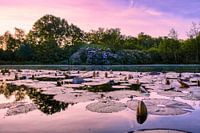 Beeld van gesloten waterlelies in een vijver met op de achtergrond een paarse Rhododendron in bloei tegen de lichtpaarse lucht van de opkomende zon.