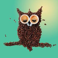 Macrofoto waardoor de koffiebonen heel scherp zijn en de uil op een zacht achtergrond staat