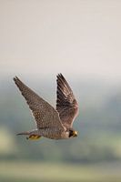 Slechtvalk / Eendenvalk / Wanderfalke ( Falco peregrinus ) in vlucht, in zijn territorium, hoog boven het platteland, wilde dieren, Europa.