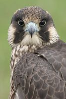 Een portret van een Slechtvalk tegen een groene achtergrond. Deze vogel is het snelste dier op aarde, in een duikvlucht naar beneden, op weg naar zijn prooi, haalt dit dier ongelooflijke snelheden. Prooidieren kunnen elk vliegend dier zijn, zoals vogels als leeuweriken, steltlopers en duiven, tot vleermuizen. Slechtvalken jagen vaak in…