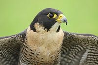 Een portret van een Slechtvalk tegen een groene achtergrond. Deze vogel is het snelste dier op aarde, in een duikvlucht naar beneden, op weg naar zijn prooi, haalt dit dier ongelooflijke snelheden. Prooidieren kunnen elk vliegend dier zijn, zoals vogels als leeuweriken, steltlopers en duiven, tot vleermuizen. Slechtvalken jagen vaak in…