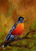Slechtvalklijster is een acryl schilderij in portret formaat geschilderd door de kunstenaar Karen Kaspar. Een slechtvalklijster zit op een tak in het bos en kijkt naar rechts. De achtergrond is geabstraheerd. De kleuren van het aangegeven gebladerte van de boom weerspiegelen de warme oranje en rode tinten van de borstveren van de vogel.