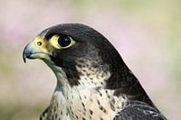 Slechtvalk gefotografeerd bij een valkenier. De wazige achtergrond steekt mooi af tegen de kop.