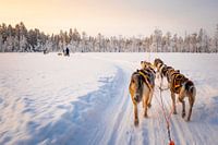 Enkele sledehonden trekken de slee verder terwijl de zon slaan onder gaat. Een winters beeld uit Fins Lapland.