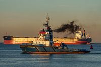 De sleepboot is net de sleepboothaven bij het Beerkanaal uitgevaren om een schip op te vangen en deze naar de kade te begeleiden.
