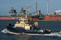 De sleepboot vaart naar IJmuiden. Met op de achtergrond de bulkcarriers en Tatasteel. De mooie boeggolf en de golven in de haven.
