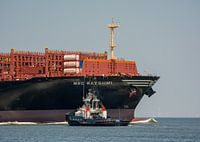 Sleepboot de enorme boeg van een containerschip op de horizon windmolens. De Maasmond de ingang van de haven van Rotterdam.