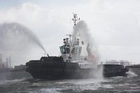 De sleepboot in actietijdens het achteruitvaren. De waterkanonnen geven een groot watergordijn. De containerkranen op de Maasvlakte als achtergrond. De foto gemaakt in de machtige haven met grote sleepboten en enorme containerschepen. Ik fotografeer de havens van schepen tot kades.…