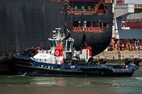 Sleepboot VB Tiger op Maasvlakte bij een Containerschip.