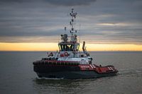 Sleepboot Waterstroom van Wagenborg op de Westereems bij de Eemshaven tijdens zonsopkomst.