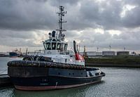 Koop dit landschapskunstwerk Sleepboot afgemeerd in de Eurpoort met de dreigende wolken. van scheepskijkerhavenfotografie op canvas, aluminium dibond, (ingelijste) fotoprint, behang en ArtFrame, op maat geprint in Fine-Art kwaliteit.