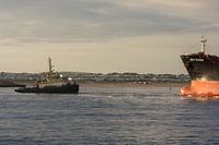 Sleepboot en vrachtschip in de haven van IJmuiden.