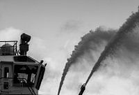 Detail van een sleepboot in actie met haar waterkanonnen. Omgezet naar zwart wit zo komen de waterstralen beter uit en de enorme waternevel. De bemanning in de stuurhut de lichte bewolking aan de lucht op een zonnige maar winderige dag. Deze foto is gemaakt tijdens een rondvaart voor havenfotografie door de haven van Rotterdam.