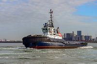 Sleepboten in actie en onderweg naar de volgende klus. De Maasvlakte in de haven van Rotterdam. Op de achtgrond de bedrijven en havenkades. De sleepboot op manoeuvre voor de camera wat een spektakel om te zien. De havens zijn altijd in beweging.