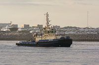 Tugboat Triton klaar voor de actie wachtend voor een binnenkomend zeeschip. Wachtend bij de vakantiehuisjes bij het strand van IJmuiden. De bemanning van de sleepboot maakt zich klaar door de trossen klaar te leggen.