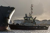 Sleepboot tijdens het afmeren van een schip in de haven Amsterdam.