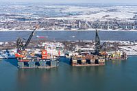 De Sleipnir (het grootste kraanschip ter wereld) en haar iets kleinere zusterschip de Thialf met winterse omstandigheden vanuit de lucht gefotografeerd boven het Calandkanaal.