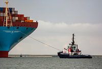 Slepers en grote containerschepen op de Maasvlakte een onderdeel van de haven van Rotterdam. Zonder de loods en de sleepboot komt dit containerschip nergens.
