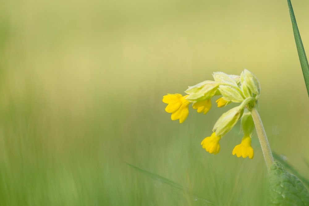 Sleutelbloem (primula) met gele bloesems in een weiland in de lente, perspectief op grondniveau, selectieve focus