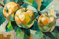 Sliced Atmosphere - Dit fruit schilderij toont een fascinerende interpretatie van twee appels, opgebouwd uit een veelheid van abstracte, geometrische vlakken die met scherpe lijnen zijn afgetekend. Deze complexe, bijna kubistische stijl daagt de traditionele representaties van fruit uit door te spelen met textuur, perspectief en…
