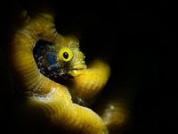 Dit fantastisch grappige visje woont in dit roze koraal, gefotografeerd in de Caribische Zee rond Curaçao.