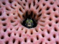 Dit fantastisch grappige visje woont in dit roze koraal, gefotografeerd in de Caribische Zee rond Curaçao.