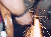 De vonken van de slijpsteen en het ijzer wat bewerkt wordt. De ruwe handen van de smid en het getekende werkschort. Het werkstuk verborgen in de hand de vonken die op de camera afkomen. De abstracte foto met lange sluitertijden gemaakt in een kleine werkplaats een intense foto.