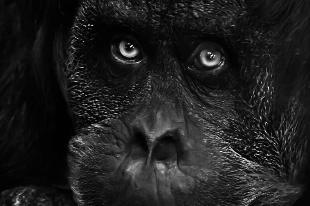 Slim gezicht orang-oetan close-up. Flegmatische licht ironische blik in de ogen. Donkere, zwarte achtergrond