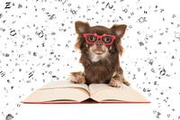 Schattige intelligente chihuahua liggend op een boek met bril en zwevende letters