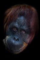 Slimme gezicht orang-oetang van dichtbij. Flegmatische licht ironische ogen kijken. Geïsoleerd op zwarte achtergrond.