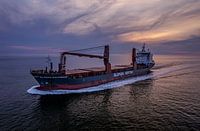 Dit vrachtschip, de Sloman Discoverer passeerde na zonsondergang de kustlijn van Westkapelle, Nederland. Na een prachtige zonsondergang liet blue hour mooie kleuren in de lucht zien, in de verte doemde dit vrachtschip op. Ik zag hem op tijd aankomen waardoor ik in staat was mijn drone de lucht in te laten om vervolgens dit vrachtschip…