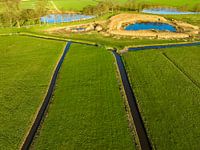 Sloot door groene weiden van bovenaf gezien met de oude Zuiderzeedijk Zwartendijk op de achtergrond in de IJsseldelta bij Kampen in Overijssel, Nederland.