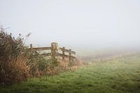 Sloot met hek in Fries landschap in de ochtendmist. In nationaal park de Alde Feanen.