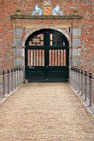 Een beeld van de brug die leidt naar de poort van Slot Haamstede. De brug is omgeven door stevige leuningen en een rasterwerk. De poort is indrukwekkend, met grote deuren die rijkelijk zijn versierd. Boven de poort prijken historische ornamenten die de status van het slot benadrukken. Op de achtergrond is een deel van het historische slot zichtbaar. Een beeld van de schoonheid van oude, historische architectuur.