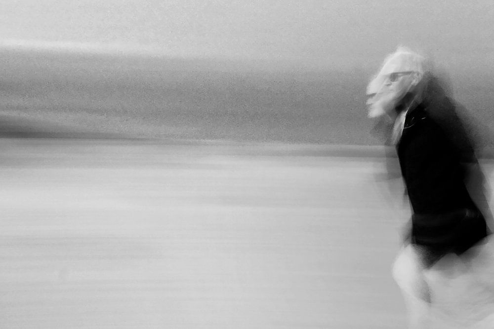In de rust zijn wat details van de persoon de waar te nemen. De duinen, lucht en zee vervagen door de snelheid in de grove korrel.