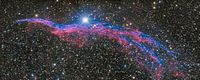 Deze foto van de Sluiernevel in sterrenbeeld Zwaan is prachtig vanwege zijn blauwe en roze rode tinten. Het is het overblijfsel van een nova, 5000 tot 8000 jaar geleden. Dit is een deel van de sluiernevel, de andere helft is ook deze gallerij te vinden.
