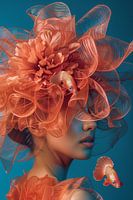 Portret van een prachtige vrouw gehuld in oranje sluiers van zijde, net zoals de oranje sluierstaartvisjes. Van de sluiers is ook een mooie bloem gedrapeerd op haar hoofd. Een prachtige blauwe achtergrond die weerglanst in haar gezicht zorgt voor een oceaangevoel. Passend bij diverse stijlen en trends, zoals modern abstract, bloemen en vissen. Artist: Bianca ter Riet
