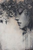 Sluimerende Schoonheid - Dit vrouwenportret schilderij toont een vrouw met gesloten ogen omgeven door een krans van sierlijke, abstracte bloemen in gedempte grijze en zwarte tinten, waarbij de zachte gelaatstrekken in contrast staan met de donkere, naar beneden stromende verfstreken die melancholie suggereren.