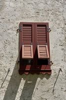 Houten luik op de gevel van een oud woonhuis in de oude stad Limone Sul Garda aan het Gardameer in Italië. De oude stad Limone Sul Garda is de bestemming van veel toeristen van over de hele wereld en staat bekend om een prachtig middeleeuws stadsgezicht.