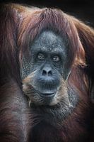 Sluwe orang-oetan roodharige orang-oetan die ontstemd voor zich uit kijkt krachtig antropoïde volledig gezicht